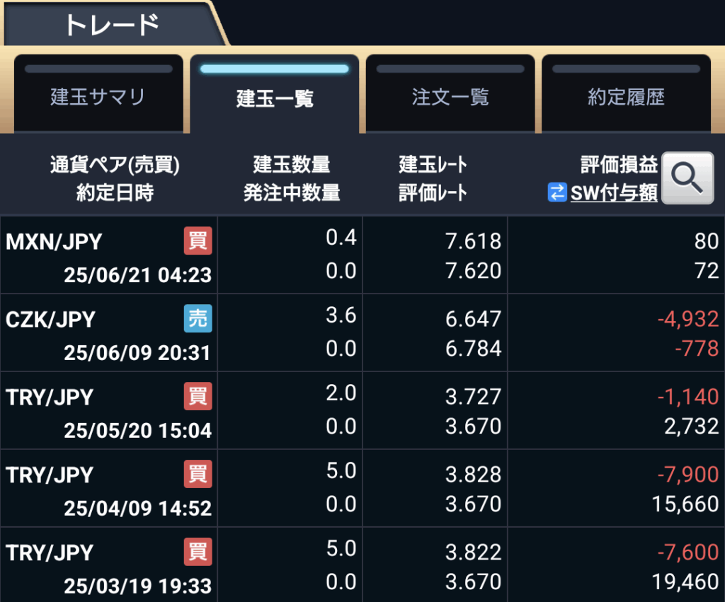 FXネオはあまり変化点ありませんが、やらかしCZKポジションがちょっとずつスワップポイントをマイナスにしているのと、ポジションは減っているのに評価損は減らない(=1Lotあたりの損が増えている)ところが、少しだけ足を引っ張っていますね。