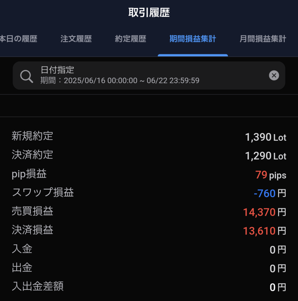 今週も先週同様、裁量トレードでショートポジションを日を跨いで保持していて、若干スワップポイントが少ないですが、安定してプラスになっています。