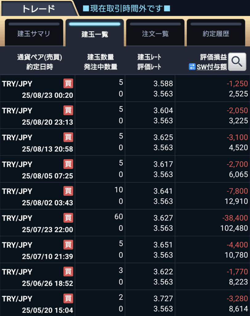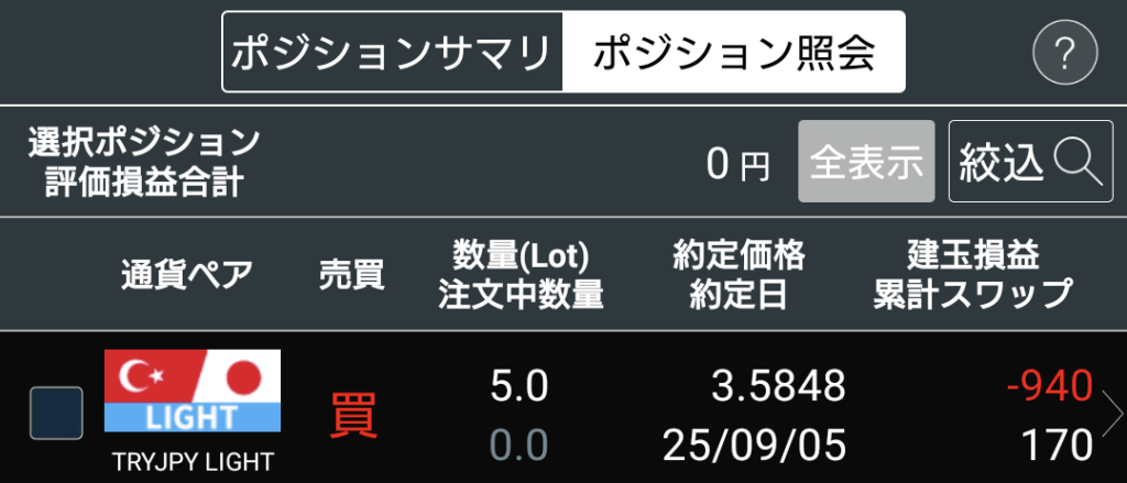 LIGHTペアというスワップポイントやスプレッドが優遇された買い方があるため、こちらの建玉上限(TRYは100LOT)までは買い増していけるといいなと思っています。(。-∀-)